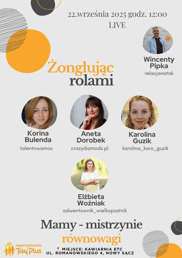 Już 22 września 2025 r. w Nowym Sączu odbędzie się wydarzenie, które odczaruje stereotypy dotyczące macierzyństwa. Spotkanie pod hasłem „Mamy – mistrzynie równowagi" pokaże, że bycie mamą wielodzietną nie ogranicza, lecz rozwija – budując kompetencje szczególnie cenione we współczesnym świecie.